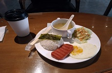 月から金の朝食のみ、GOGOCAFEで提供。ごはんも日本とほぼ同じ味。1食でもありがたい。